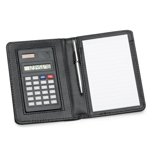 Bloco Calculadora com capa em couro sintético.