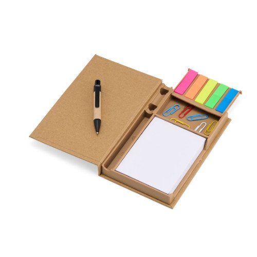 Capa produzida em papel ktaft, estrutura interna plástico em cor kraft contendo compartimentos para caneta, porta clips, gaveta com 5 post-it nas cores: laranja, verde, rosa, amarelo e azul e um bloco de anotação branco com 100 folhas. Além disso contém mini caneta e 7 clipes coloridos. Cod. 909