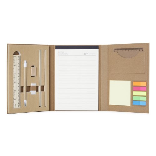 Bloco ecológico grande para personalizar como brinde. Possui folhas 40 folhas pautadas , bloquinhos post it coloridos e uma caneta em material reciclado.Além disso também possui 2 lápis, borrracha e apontador. Cod. 1068