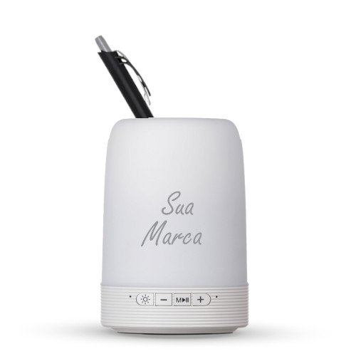 Caixa de som com porta caneta e luminária feita em material plástico branco. Um biinde super completto possuindo 11 modos de luzes, Bluetooth, Rádio , Entrada MicroSD, Entrada DC 5V; Entrada Auxiliar/P2, Botão Off/On e Entrada USB. Código : 2017