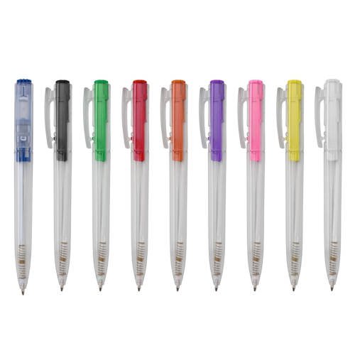 A estrutura transparente da caneta permite que com todos os componentes sejam visualizados. Faça um pedido a partir de 100 unidades personalizadas .