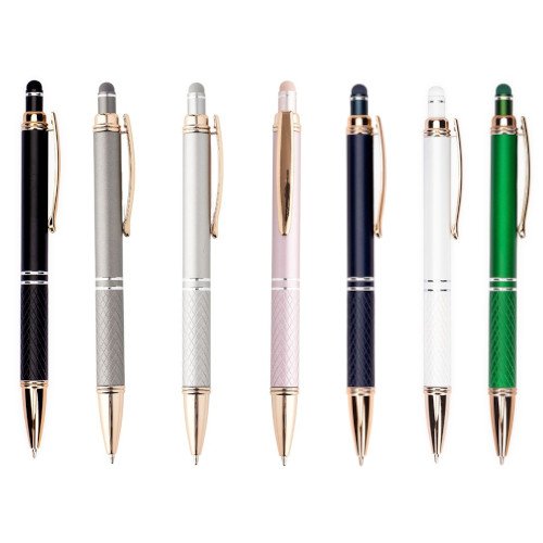 Caneta personalizada luxo com touch na outra extremidade . Ponteira 1.0 esferográfica, acabamentos dourados , dois anéis próximos ao grip. Grip com mini lozangos desenhados em baixo relevo. Código do produto : 5020