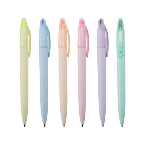 Caneta plástica com ponta de marca-texto e tampa protetora, com carga esferográfica azul de 1,0 mm e sistema de ativação por rotação Corpo translucido em 6 opções de cores. Tampa protetora para o marca texto. cod 6055