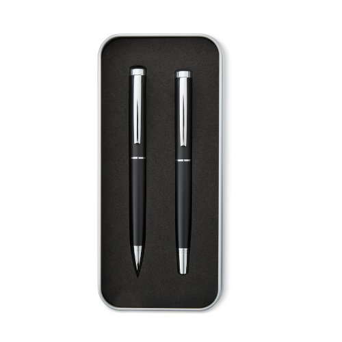 Conjunto de canetas clássico. Estojo em metal com berço em espuma contendo uma caneta roller em metal com carga 0.7mm e outra caneta esferográfica metálica com carga 1.0mm.