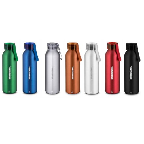 Garrafa em alumínio reciclável 600ml com tampa plástica em cor translúcida de rosca que garante fechamento seguro e evita vazamentos. Possui alça emborrachada para transporte.