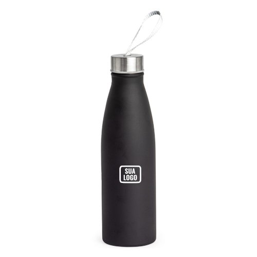 Garrafa preta inox personalizada em cor preto fosco com cordão de nylon na tampa.