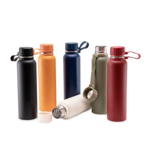 Garrafa térmica 1l com infusor de bebidas. Tampa com rosca com alça de silicone. Base antiderrapante.