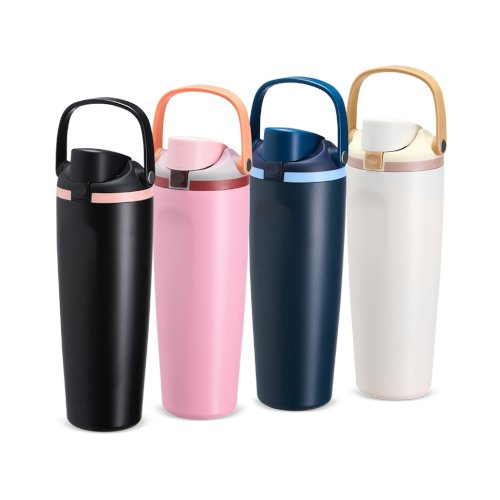 Garrafa térmica em inox 850ml de capacidade, SIstema de isolamento térmico contendo parede dupla , vedação vácuo. Possui ainda tampa rosqueável com protetor bocal, botão de acionamento e trava de segurança. Para auxilio no transporte há uma alça articulada na tampa.