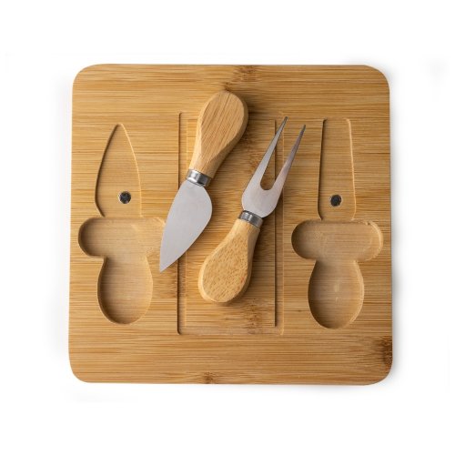Kit queijo tábua Quadrada, 3 peças: tábua de bambu com canaleta e espaço vazado no formato dos itens. Possui ainda faca e garfo para queijo. Narea de encaixe da faca e garfo na tábua há um imã centralizado para auxiliar na fixação deles.