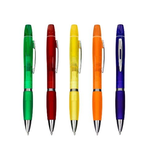 Em uma ponta caneta na outra extremidade marca texto. Possui clip metálico com vazado. Possui tampa protetora para o marca texto. Corpo colorido translucido para personalizar com a cor de sua marca.