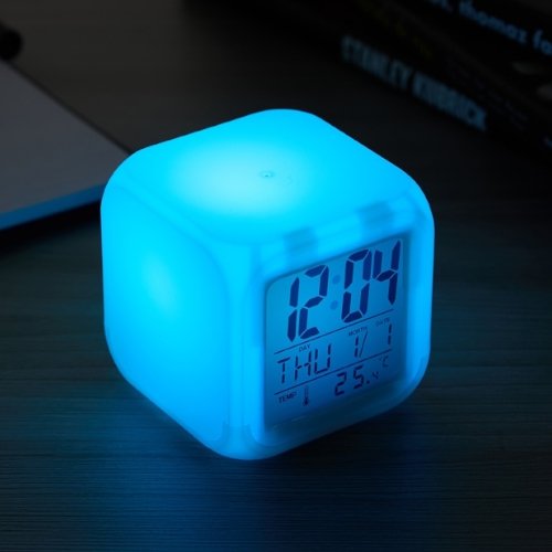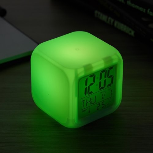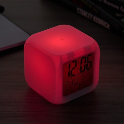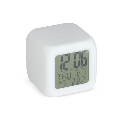 Formato cubo, com um display de led multifuncional com as funções de horas, data, temperatura .